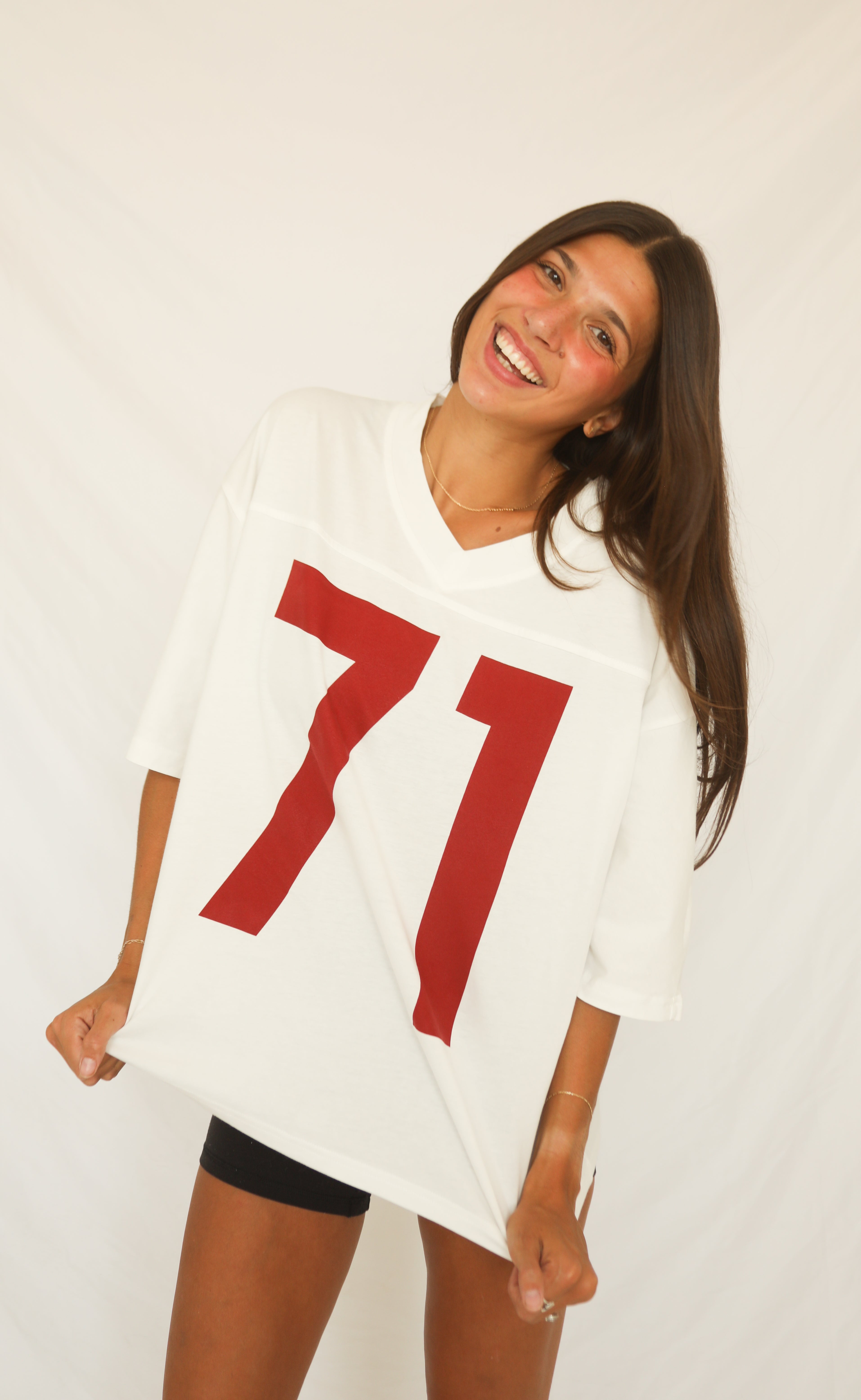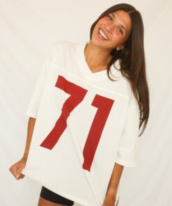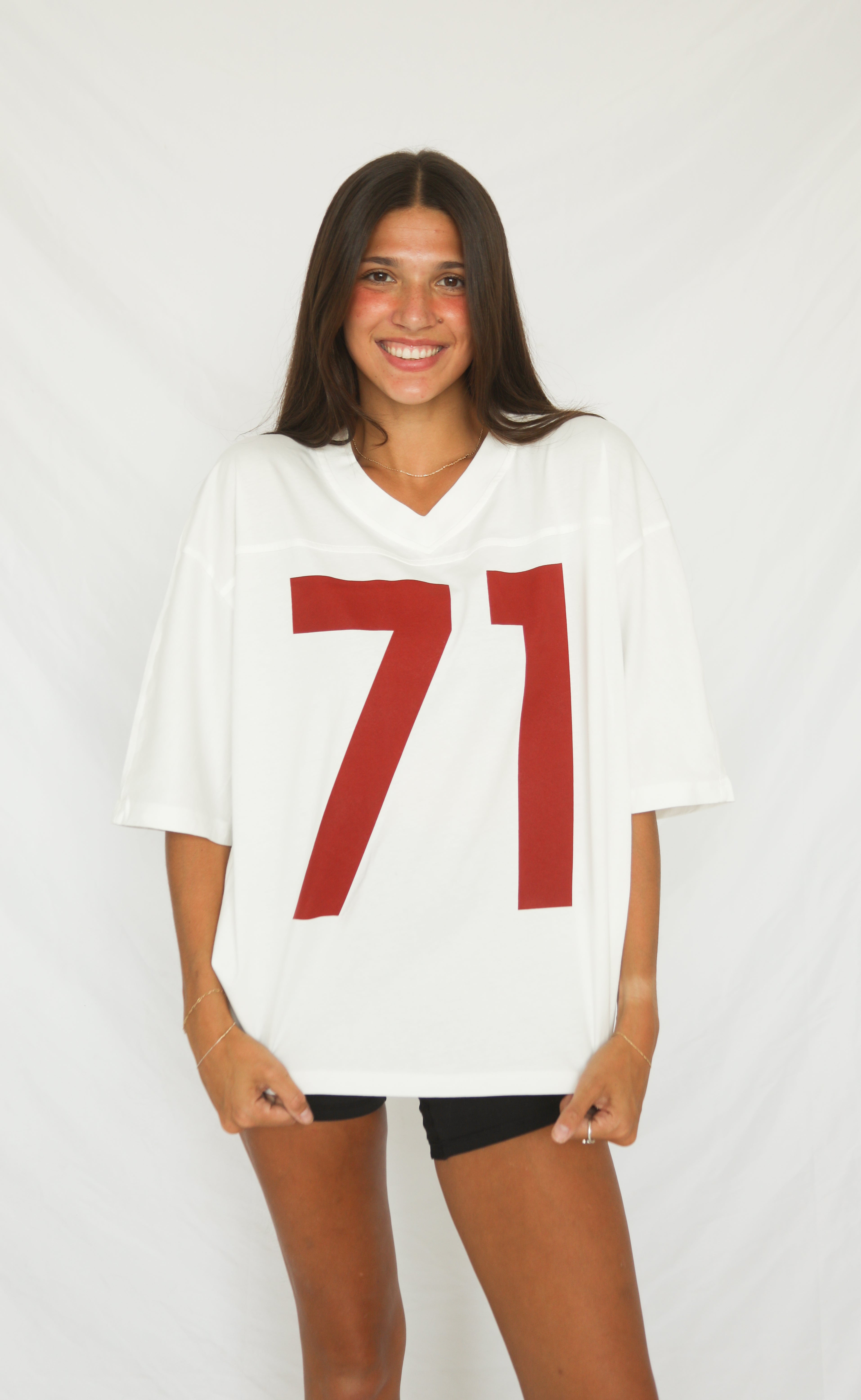 Rep the Razorbacks in this oversized t-shirt jersey! This 100% cotton tee features a v-neckline, drop shoulders and an oversized 71 on the front. Spin around to see the block “ARKANSAS” across the upper back.