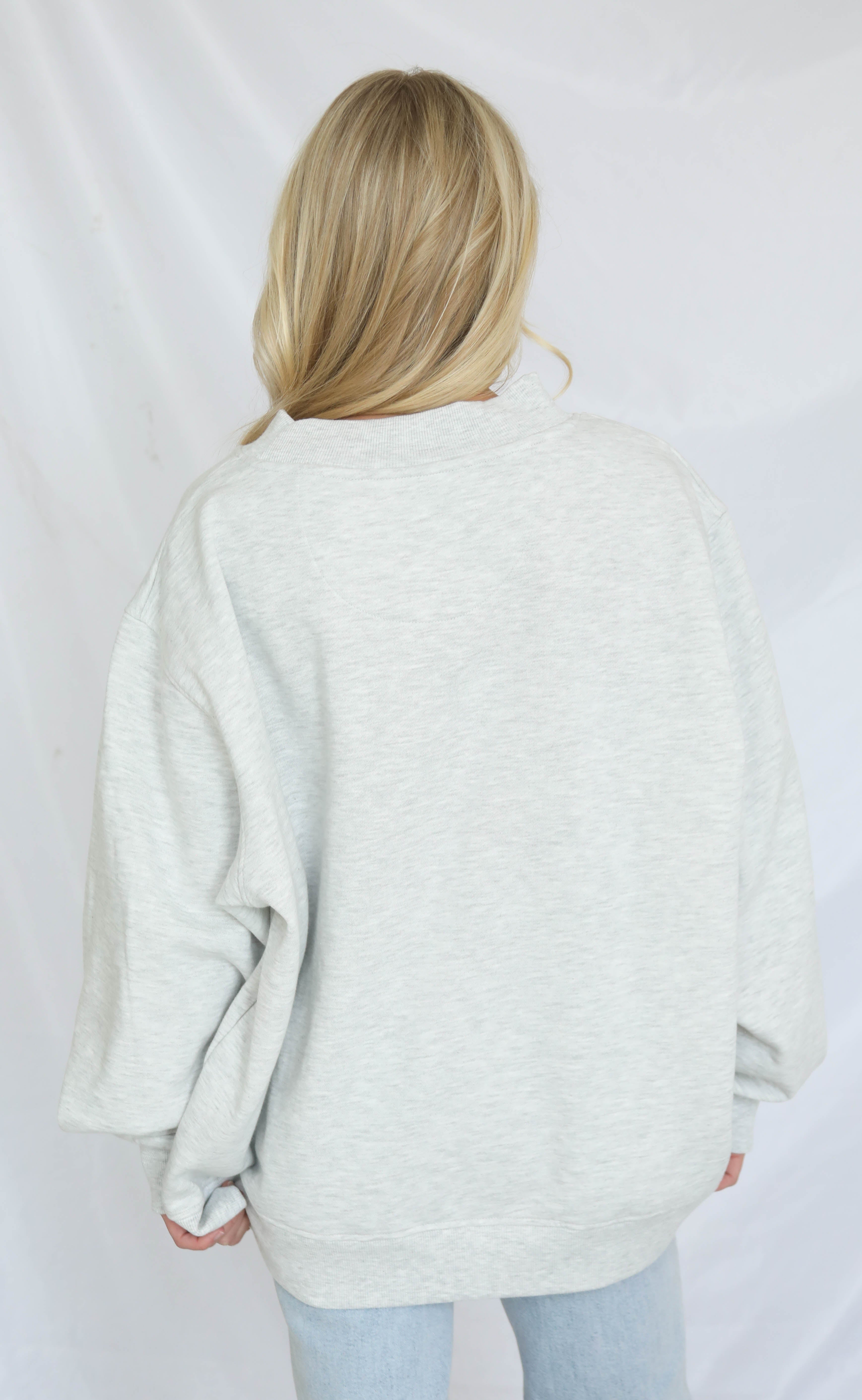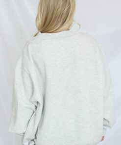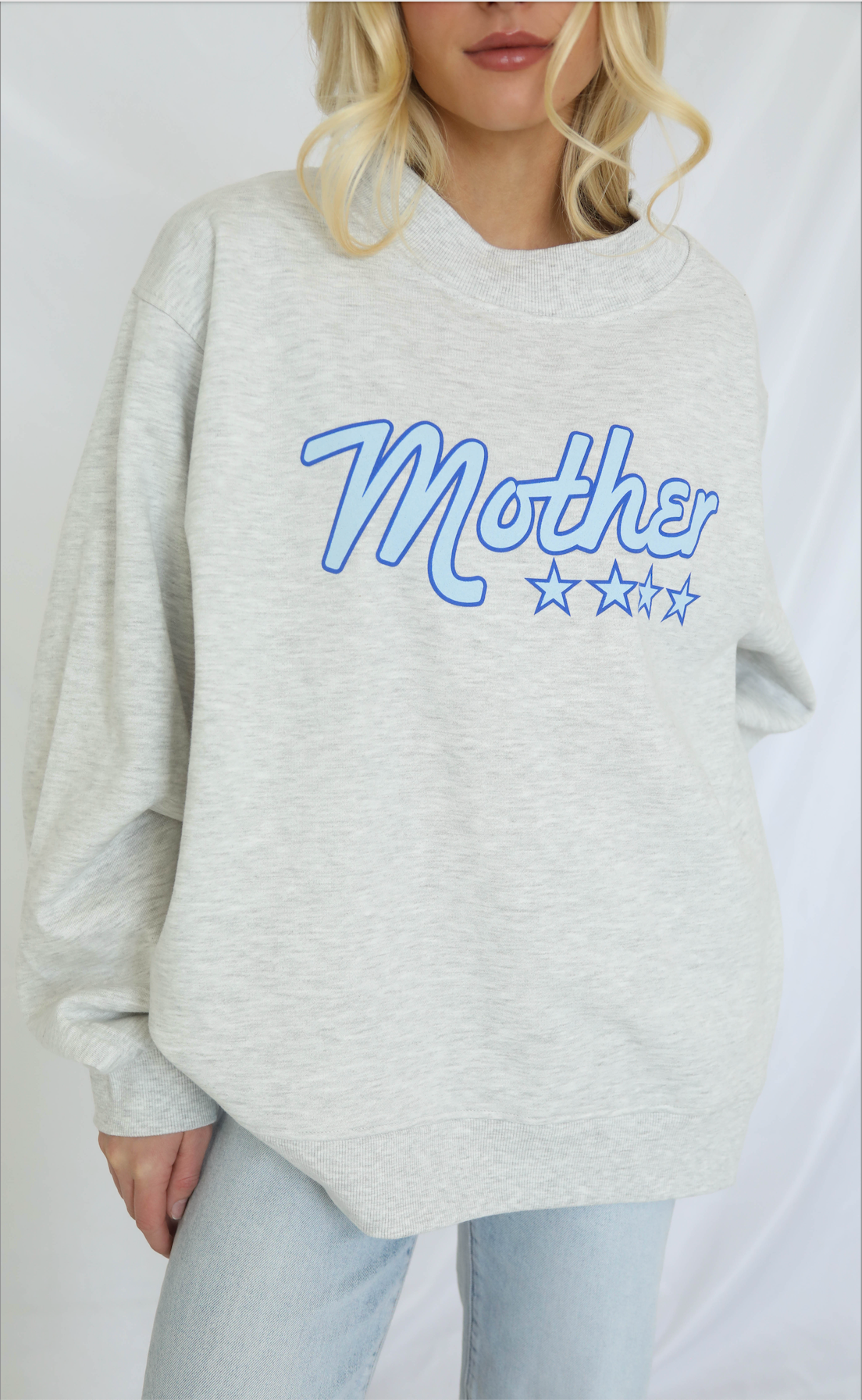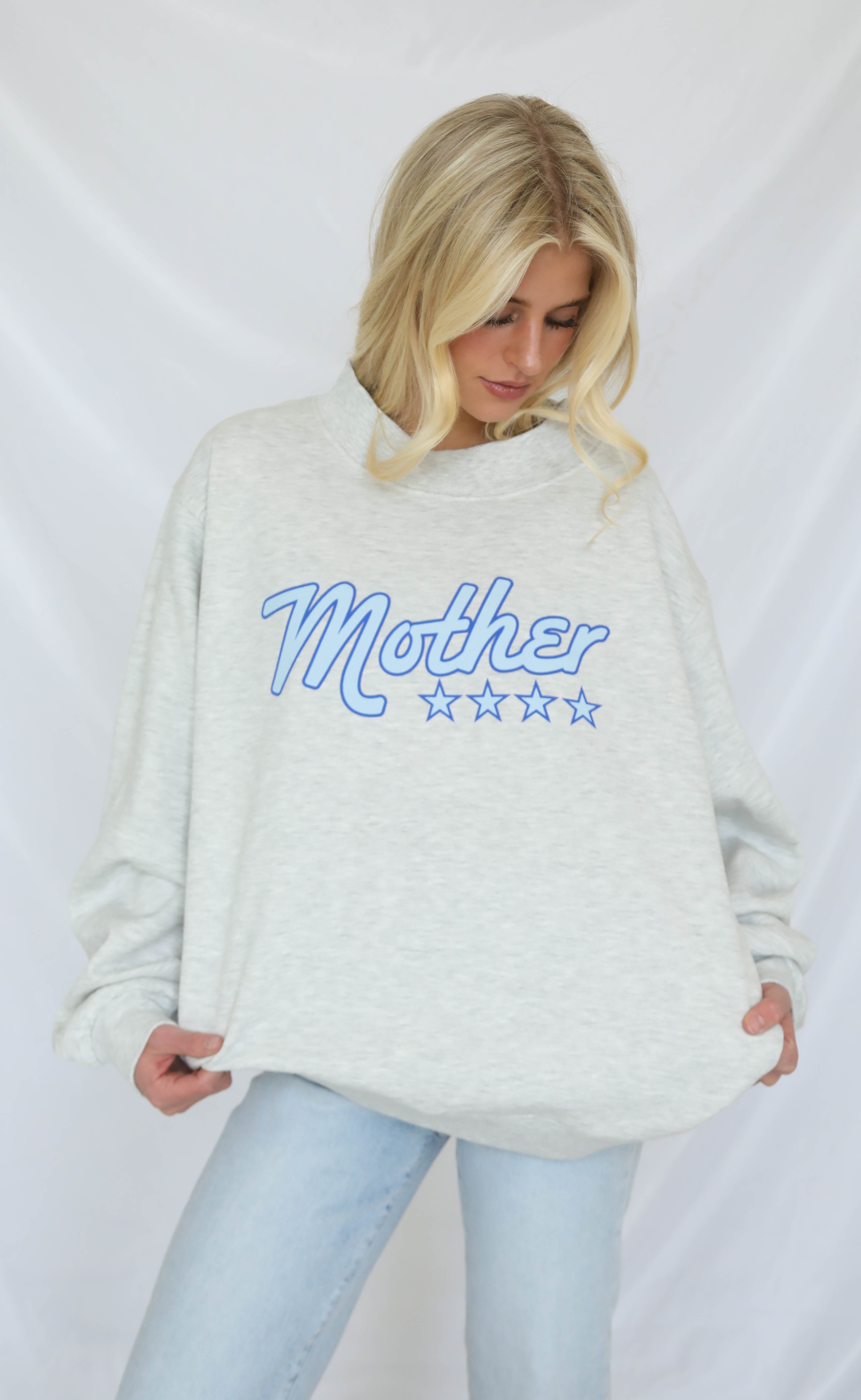 A timeless ash grey mock neck with a soft blue Mother script and star details that feel both chic and meaningful. It’s lightweight, cozy, and just oversized enough for that lived-in comfort you’ll reach for again and again. A perfect everyday piece you can style year-round.