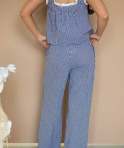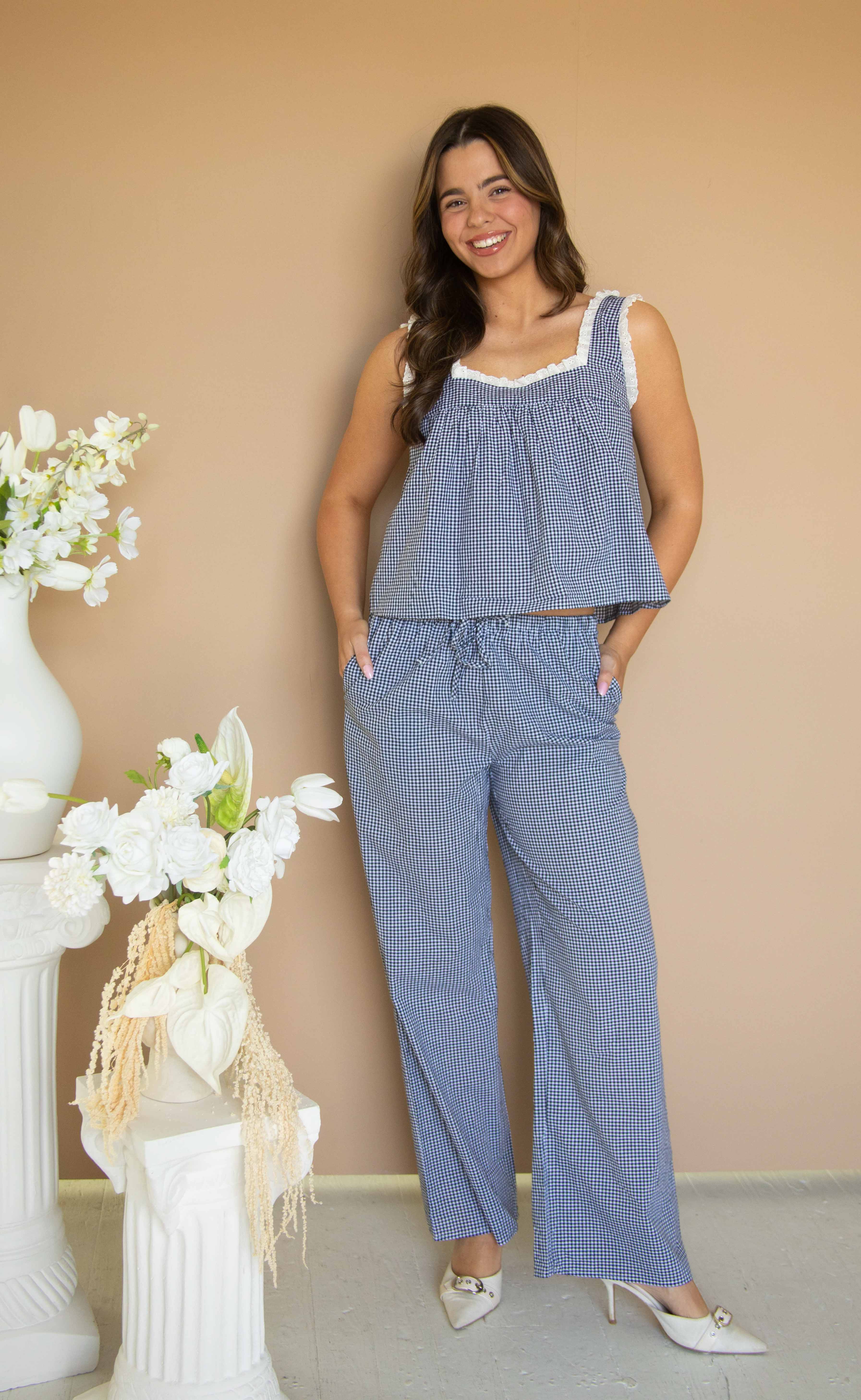 Spring starts here. This dark navy gingham set is the effortless outfit your warm-weather wardrobe has been waiting for. The babydoll tank features a flattering square neckline with scalloped eyelet lace trim for a feminine, elevated touch, while the relaxed fit keeps it easy and breezy. The pull-on wide leg pants with pockets add comfort and polish, making this the perfect throw-on-and-go spring outfit. Wear the full gingham set together for a statement look or mix and match for endless styling options all season long.