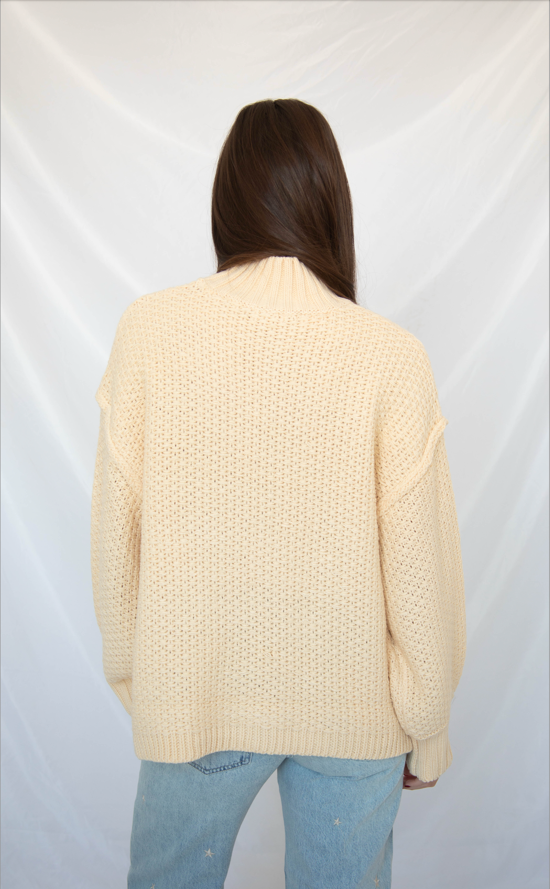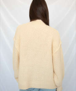 This thick, chunky knit cardigan in a soft cream shade brings cozy texture with an elevated silhouette. Designed with relaxed drop shoulders, a ribbed mock neck collar, statement bishop sleeves, and a longer hem, it feels warm, polished, and effortlessly stylish.