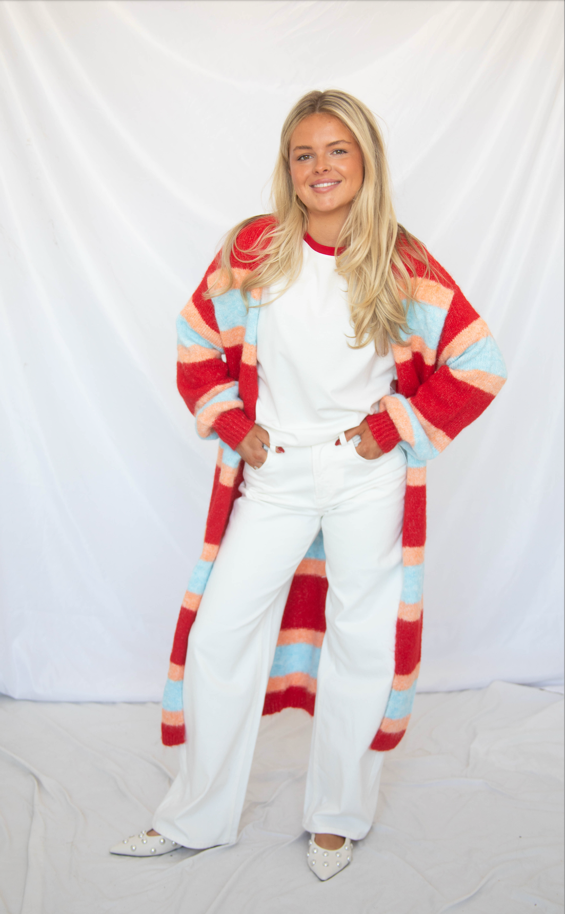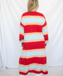 This maxi-length open front cardigan brings bold color to an effortless layering piece. Designed in a fun red, blue, and orange stripe, it drapes beautifully with a relaxed, easy fit while making a statement through color and length.
