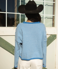 This midweight striped cardigan blends cozy comfort with timeless style. Designed with a raw rolled collar, button-up front, drop shoulders, and long sleeves, it has a relaxed, boxy fit. The blue and white combo is crisp and classic, perfect for a fresh, playful touch.