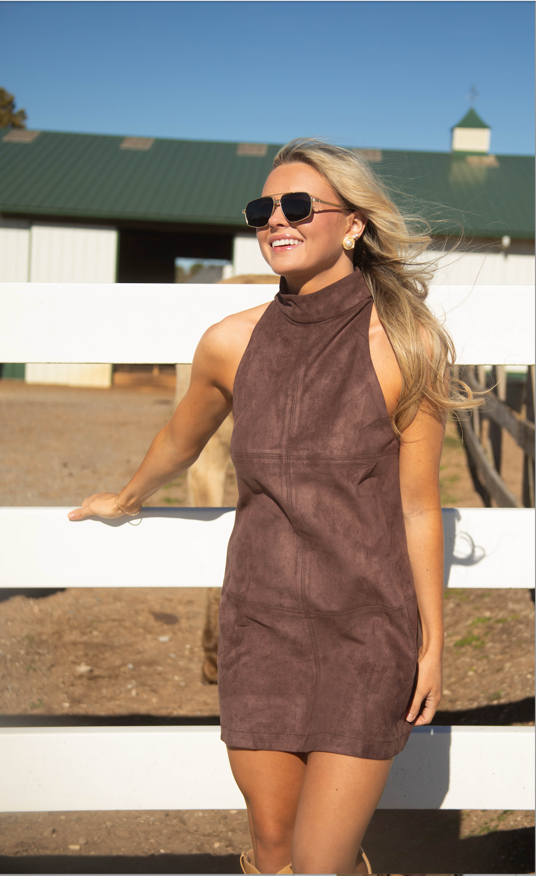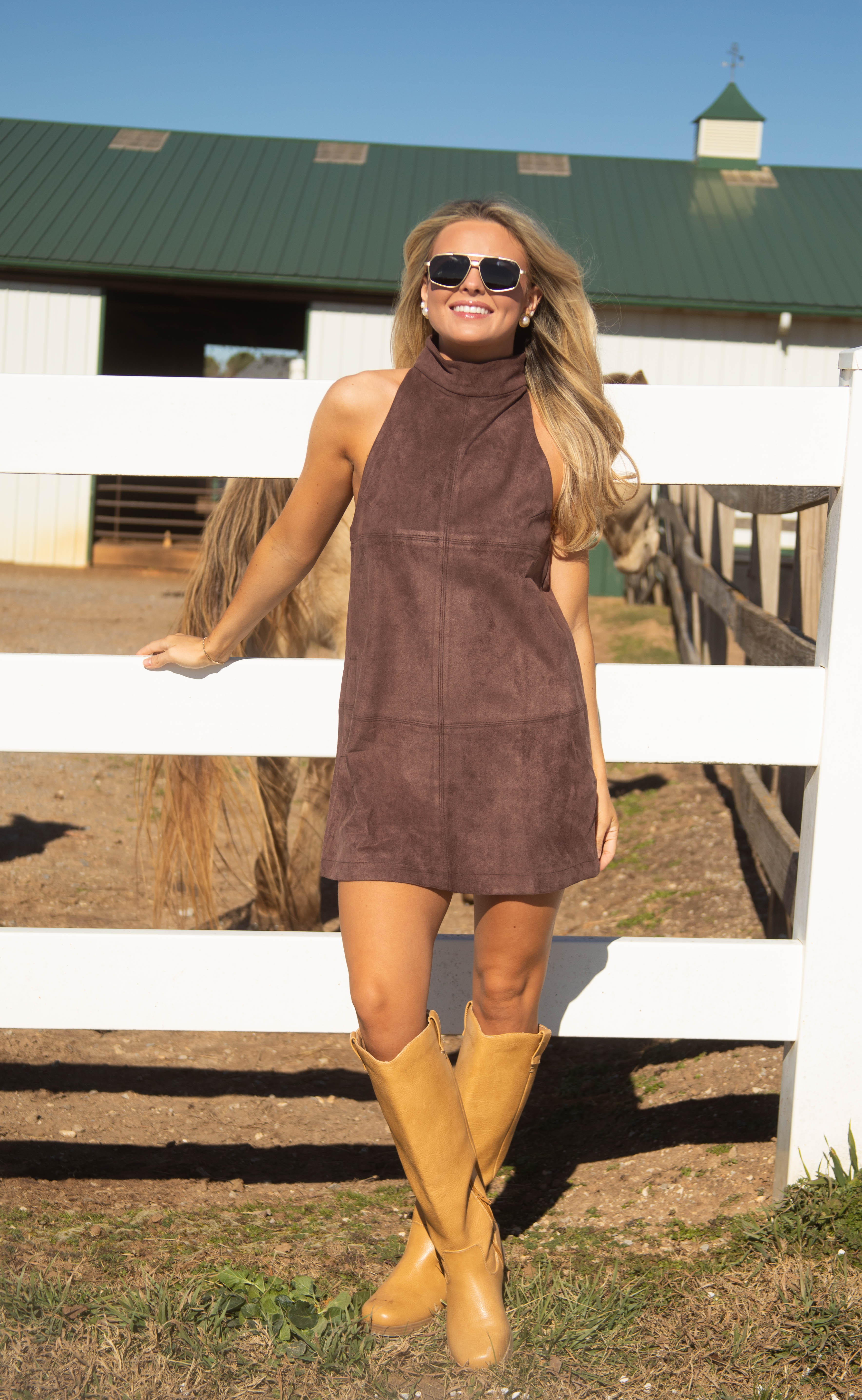This dark brown suede shift dress combines sleek sophistication with subtle western-inspired details. Sleeveless with a high mock neck, it features stitch seam accents and functional pockets, creating a polished, effortless silhouette.